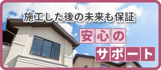 工事中の不具合は工事保険に、工事中に家財に損害があった時には損害保険に。さらに全ての工事に10年、もしくは15年の自社保証と充実の保証で万が一の時にも安心いただける体制を整えています。